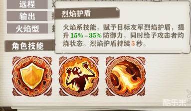 烈焰护盾:火焰系技能,赋予目标友军烈焰护盾,提升15%~35%防御力。同时给予攻击者灼烧状态。烈焰护盾持续5秒。