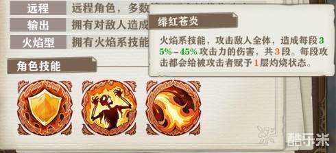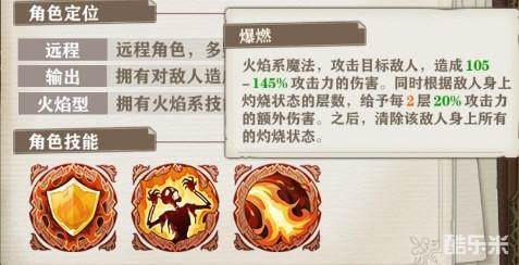 爆燃:火焰系魔法,攻击目标敌人,造成105~145%攻击力的伤害。同时根据敌人身上的灼烧状态的层数,给予每2层20%攻击力的额外伤害。之后,清除该敌人身上所有的灼烧状态。