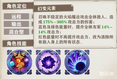 幻变元素:召唤不稳定的火焰魔法攻击全体敌人,造成175%~305%攻击力的伤害;蓝色及绿色能量时,提升全体友军14%~14%攻击力;红色能量时不再提升攻击力,改为消除所有敌方身上的状态。