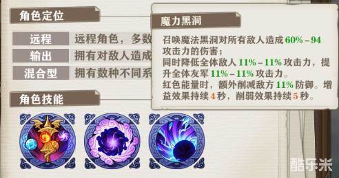 魔力黑洞:召唤魔法黑洞对所有敌人造成60%~94%攻击力的伤害;同时降低全体敌人11%~11%攻击力,提升全体友军11%~11%攻击力。红色能量时,额外削减敌方11%防御。增益效果持续4秒,削弱效果持续5秒。