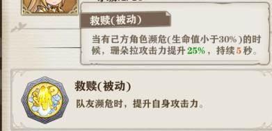 救赎:当有己方角色濒危(生命值小于30%)的时候,珊朵拉攻击力提升25%,持续5秒。