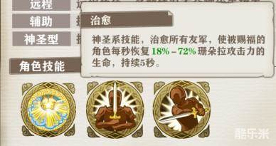 治愈:神圣系技能,治愈所有友军,使被赐福的角色每秒恢复18%~72%珊朵拉攻击力的生命,持续5秒。
