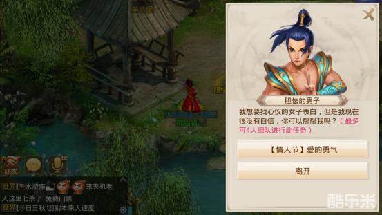 帮“NPC”追妹子,一段独特的追爱之旅即将启程!揽仙镇外出现一位“胆怯的男子”,缺乏自信,希望大家能帮其准备情人节礼物。道友需经历一系列交涉甚至战斗,才会凑齐“最美的花”、“最美的玉佩”和“家传的斩妖剑”,并帮助“胆怯的男子”锻炼胆识,使其鼓起勇气,向心仪女子表白。