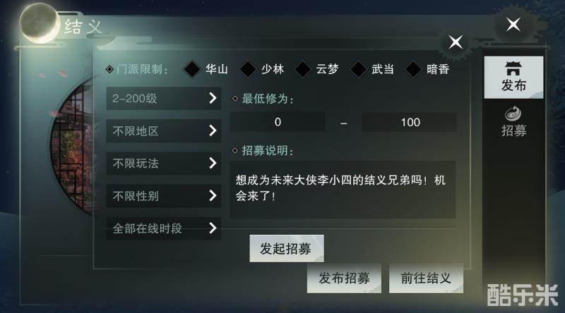 若是想感受兄弟友情却暂时没有可以结义的人,玩家也不必担心。江湖那么大,侠士那么多,结义招募里翻看一遍,就能轻松寻找到志同道合的江湖好友。