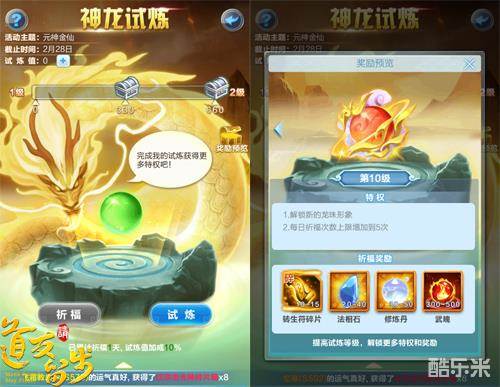 小编在接触了神龙试炼玩法后,深深体会到“《道友请留步》是0氪党的福音”这句话绝对不是吹的。神龙试炼玩法包括神龙祈福和试炼任务两个部分。道友们通过向神龙祈福即可获得随机奖励,累计祈福的天数越多获得的奖励也将越丰厚。完成日常玩法即可同步获得试炼任务的奖励。神龙试炼的玩法特点在于,玩家完全不用投入额外的游戏时间就可以轻轻松松获得更多的培养材料。