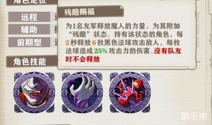 残酷赐福:为1名友军释放魔人的力量,为其附加“残酷”状态。持有该状态的角色,每2秒释放6枚黑色法球攻击敌人,每枚法球造成25%攻击力的伤害。没有队友时不会释放