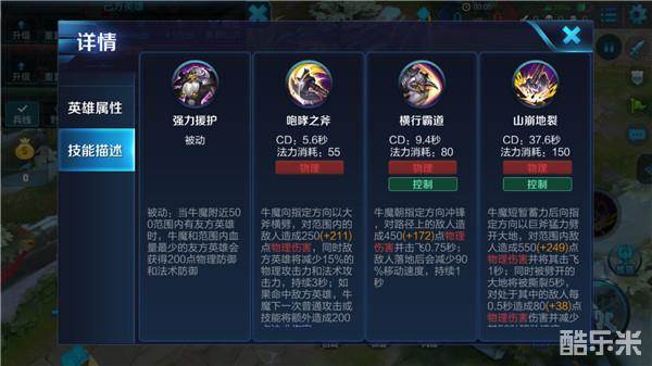 解析:牛魔向指定方向发起攻击,对范围内的敌人造成高额伤害,同时将降低敌方英雄的物理和法术攻击力,持续一段时间。如果该技能命中敌方英雄,还将强化牛魔的下一次普通攻击或技能,对目标造成额外伤害。该技能的攻击范围广,冷却速度快,实战时召唤师需要攻击尽可能多的英雄单位,以扩大技能效果。