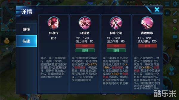 【侠客行】:李白的第四次普通攻击将会触发被动技能【侠客行】,李白将提升一定的攻击,但最重要的是该被动能解锁大招【青莲剑歌】的封印,玩家需要尽可能地触发被动来解锁大招,增加李白的技能输出。