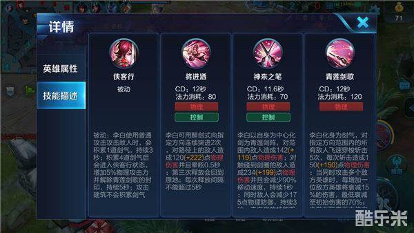 李白的被动技能可以解封他的大招,并且还能提升一定的攻击力,给了李白输出的保障。一技能有着两段位移,第三次释放回到原地的效果让该技能可以灵活的运用在追击与逃跑上面,大招的高伤害与二技能的削减护甲效果也可以与一技能配合起来让李白继续消耗与收割,这两个技能的无法选中特性也保证了李白的生存能力。