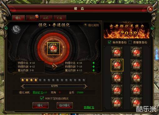 最初的普通强化消耗金币和黑铁矿石,强化有失败的概率,强化失败会增加幸运值,幸运值慢则下次强化100%成功。所以要把主角和英雄的装备都强化到15级,也是需要花费巨额的金币和黑铁矿石。黑铁矿石可以通过矿区挖矿、神秘商店和商城购买获得,矿区挖矿虽然不用花费元宝,但是黑铁矿石收集的太慢,到后期想要强化一次往往需要很多天甚至几周的时间来准备。所以为了跟上黑铁矿石的消耗,有条件的玩家还是可以去商城购买黑铁矿石的。只有快速的强化自己的装备,才能使自己的战斗力一直在玩家中名列前茅。
