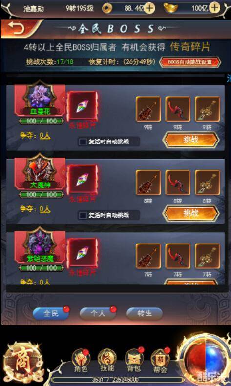 《仙魔神域》中的BOSS战是游戏中核心玩法之一。世界BOSS、个人BOSS、转生BOSS三大战场,让你在地图中随时有几率遇到随机BOSS。世界BOSS与转生BOSS每日固定时间出现,战力超强,难以绞杀,个人BOSS根据等级依次开放。击杀强力BOSS,不光能获取海量资源,还有几率产出橙装武器、衣服、碎片等。