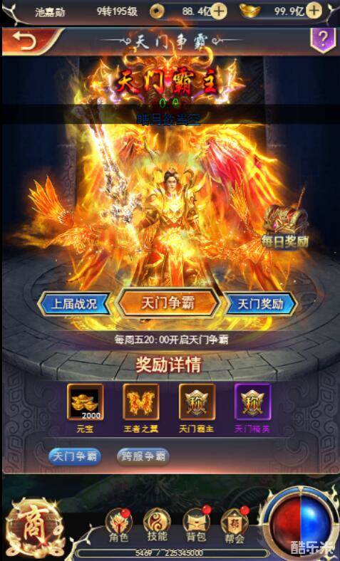 每周五晚上的8点至8点20,天门争霸正式开启。由各大帮会的玩家在场景中击杀敌对帮会的玩家与弓箭手,即可获得积分,占领皇宫前殿和天门皇宫每10秒自动获得积分。活动期间,成功采集天门皇宫中树立的皇旗并成为占领者,是为活动结束,积分最高的帮会将会成为天门的占领者,获得海量奖励。
