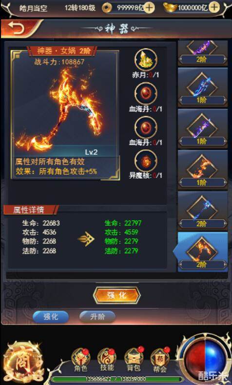 神器系统是游戏中不可忽略的一大养成玩法之一。9个不同类型的神器让你个性养成,每个神器都可以消耗材料升阶,最高200阶。不同神器不只简单的属性加成,还有特效效果,如增加百分比伤害,经验,金币等。快速升阶神器,能让你的战力更快飙升。