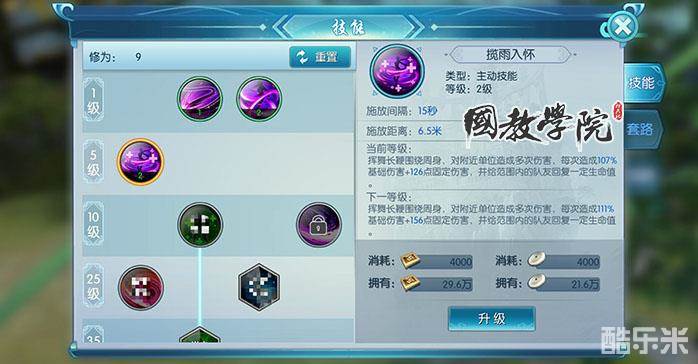 深度分析2级揽雨入怀技能来看,该技能属于主动技能,施放间隔15秒,施放距离6.5米,挥舞长鞭围绕周身,对附近单位造成多次伤害,每次造成107%基础伤害+126点固定伤害,并给范围内的队友回复一定生命值。