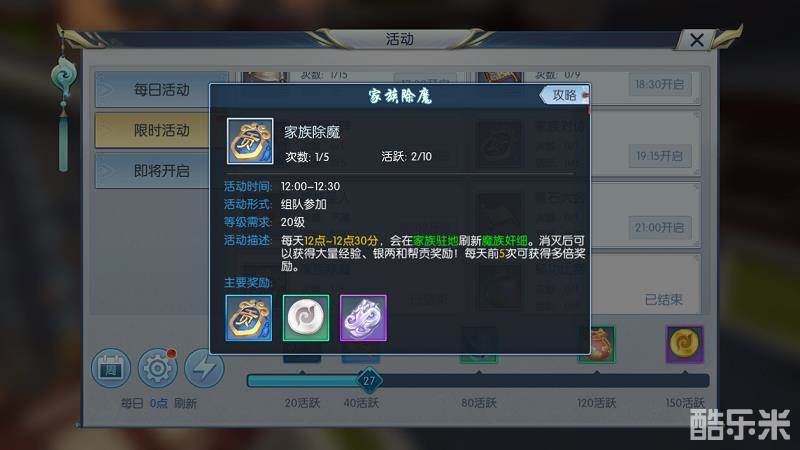 家族除魔是限时活动,只有在指定时间段才会在家族领地内刷新魔族奸细,击杀魔族奸细可以获得大量经验、银两和帮贡奖励。