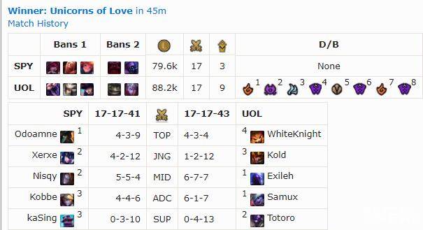 近来状态略有回暖的UOL对阵中游的SPY。双方在前期均通过打野打开局面,Xerxe和Kold成为了两队的节奏发动机,比赛打得极为胶着。中期虽然UOL拿下大龙,但SPY靠着船长的出色发挥没有给对手扩大领先的机会。平衡终于在第44分钟被打破,双方在远古巨龙处展开团战,UOL在打出1换2后,上单WhiteKnight灵性绕后,击杀了SPY的AD,最终团灭对手的UOL一波三折的拿下了比赛的胜利。