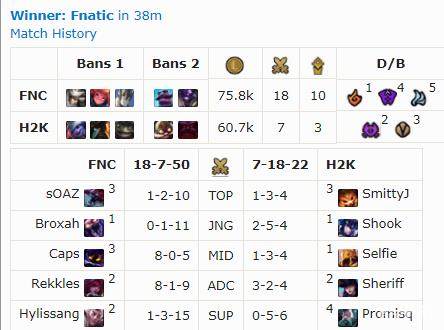 与G2一同领跑积分榜的FNC本周迎战曾经在开赛时让自己翻车的H2K。BP阶段,FNC可谓占据了优势,不光下路拿到霞洛组合,而且中单拿出了小法、打野还拿出了近来在北美颇为火热的蝎子,H2K方面则在下路拿出了女警+时光的体系应对。比赛刚刚开始,FNC利用巧妙的一级团战术拿到了一血,并依靠打野Broxah的出色发挥逐渐扩大领先。17分钟,FNC就握有5000左右的优势。虽然H2K利用沙皇和女警的手长优势组织了几波反击,但是FNC的双C在此期间没有受到任何影响,Caps更是不声不响的收获多个人头,接近超神。最终,装备碾压的双C加上出彩的团战配合,帮助FNC在中路团灭了H2K,收获胜利的同时也让他们继续领跑积分榜。