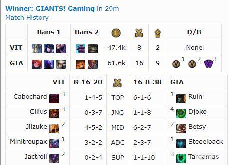 赛季初表现惊艳的VIT近来日子似乎有些不太好过,上周他们似乎被对手摸住了名门,苦吞两连败,本周对上GIA,他们渴望用一场胜利止损。不过,比赛的进程似乎出乎了他们的意料,GIA的中野反而统治了比赛,打野扎克的进场带人,配合飞机的高伤害,给VIT阵容造成了极大的威胁。拿下大龙后,GIA将经济差逐渐扩大到8000。之后,虽然VIT组织了几次反扑,而且中单Jiizuke也有着亮眼发挥,但发育更好的GIA加上伤害爆炸的上单船长成为了他们的噩梦,最终在团灭对手后,GIA顺利结束了比赛,送给VIT三连败的同时也将对手从头把交椅上拉了下来。