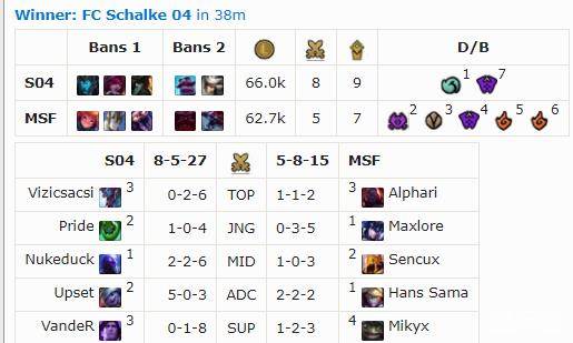 MSF开赛后的表现与VIT类似:赛季初昂首前进,近来连吞败仗,本周他们遇到了S04。两队在前期打的较为保守,没有爆发过多的人头。中期双方在各自拿到大龙后也未能展开有效的推进,两队的经济一直咬的很近。比赛的转折点出现在第37分钟,MSF在两路被破的情况下犯下重大失误,面对中路推进的S04,MSF全队选择集火远古龙,S04抓住对方门户大开的机会由瑞兹开车直接带队冲上高地,回防不及的MSF无力阻挡S04的全面进攻,最终遗憾被对手推掉了基地。