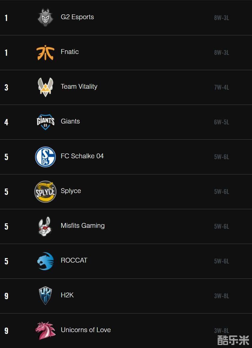 今日比赛结束后,EU LCS积分榜情况为:
