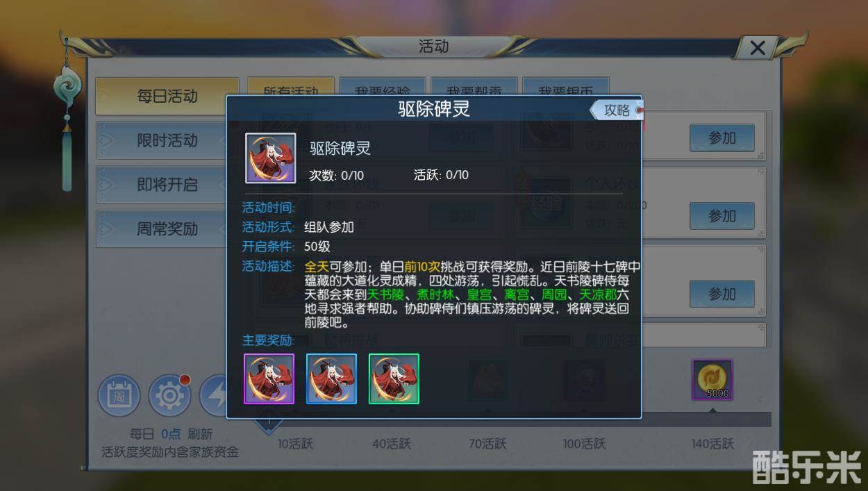 驱除碑灵活动产出的灵石是我们在50级后非常重要的提升修为的资源,因此,驱除碑灵的奖励可谓是非常丰富,各位道友一定不可错过!