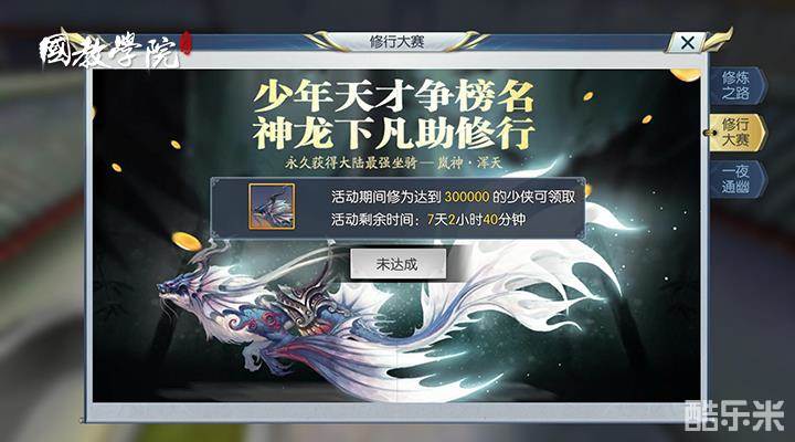 修行大赛是以开服为开始时间而进行的为期八天的活动,在八天时间内,修为达到30万即可得到永久的大陆最强坐骑——岚神·浑天。不限人数只限时间,在八天内努力修行即可获得,有没有很动心呢?