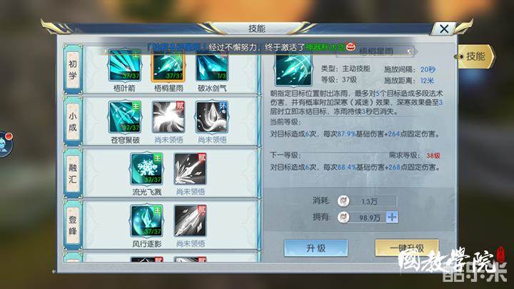 升级技能需要消耗一定的银币,在银币足够的情况下可以选择一键升级,不足时就要根据自身需要有选择地进行升级,建议优先选择没有冷却时间的普通技能。技能每提升1级,所造成的伤害效果和属性效果就会增加一些,技能等级不能超过人物等级,因此,若想要更好的技能属性,就需要尽快升级,这样才能有足够的技能提升空间。