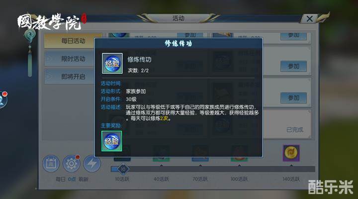 这是这次内测出来的新活动,玩家可以与等级低于或等于自己的同家族成员进行修炼传功,修炼双方都可以获得大量经验,等级差距越大,获得经验越多。每天我们可以修炼两次!