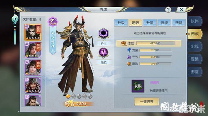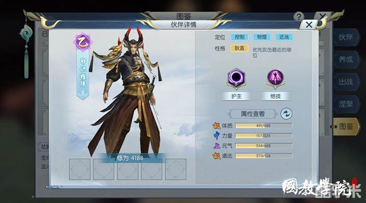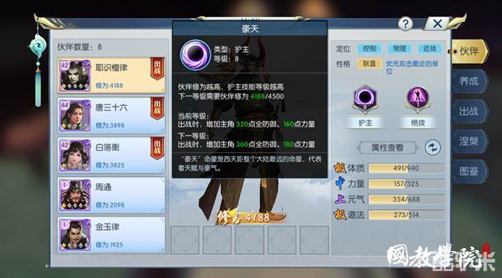 在选择伙伴时,最先要看的就是护主技能和绝技,看是否适合本门派特点。耶识檀律的护主技能豪天可以提供全防御和力量,而离山剑宗作为一个偏输出的战士,非常需要力量来提高输出,同时又因为是近战,所以全防御也非常重要。