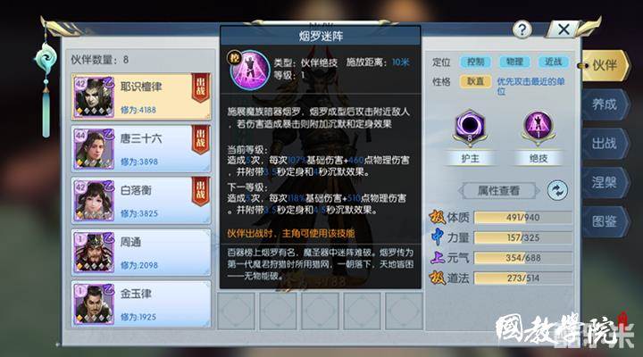 以上就是关于乙级伙伴耶识檀律的介绍了。耶识檀律的绝技是一个非常强大的控制技能,只不过非常依赖暴击,所以对于离山剑宗这种高暴击的门派来说最适合不过了。
