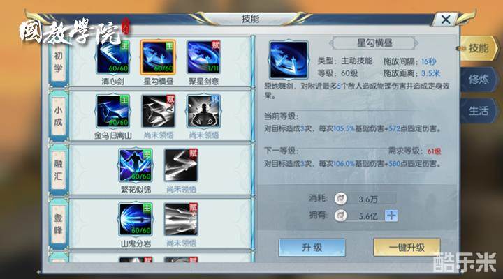 这些技能以外,还可携带三个伙伴的绝技技能,携带伙伴王破的一刀灭破,瞬间高爆发伤害,可以在控制敌人后使用。还有秋山君的金乌剑阵可以缩短技能冷却时间,这个可以在使用繁花似锦后使用。注意该技能是在其他技能使用后可缩短时间,提前使用没有效果。还有一个斡夫折袖的绝技苍狼噬月,有吸血效果,可在残血时使用,对于没有恢复技能的离山剑宗是必不可少的技能。