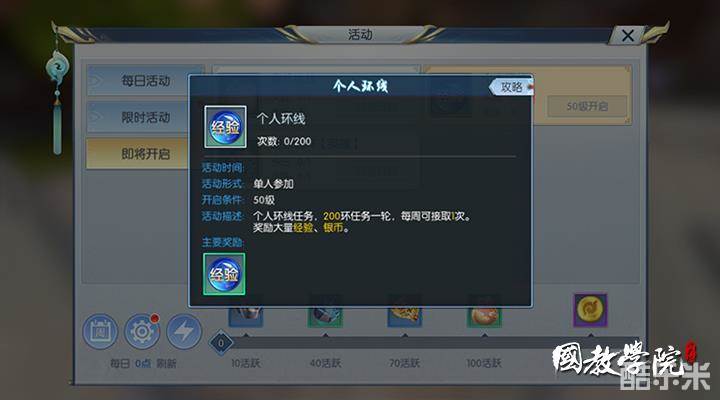 完成个人环线可以获得大量的经验和银币,但是完成这个任务也需要有一定的耐心,所以,在陈留王处接到任务之后就意味着开始了长达200环的流浪生涯,少侠准备好了吗?