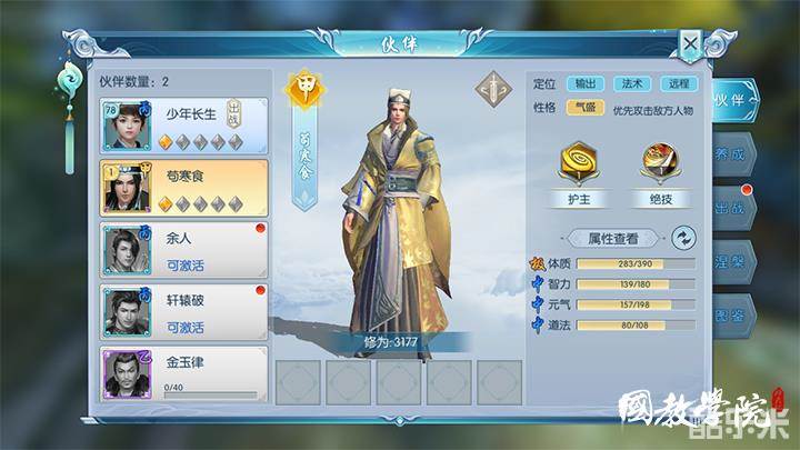 这里推荐大家携带圣级伙伴计道人和甲级伙伴苟寒食。苟寒食在不同的门派面前会有不同的属性,青曜十三司那里为近战物理型,但是在离山剑宗前则为远程法术型伙伴。是一个非常通用的伙伴,而且获得相对简单。其被动技能“护主”可以增加玩家50点韧性、50点元气和100点全攻击(原始等级)。其绝技“燎天一剑”可以造成320%基础伤害+600点法术伤害,并对敌人造成3.5秒眩晕。配合离山剑宗的定身技能效果非常好。