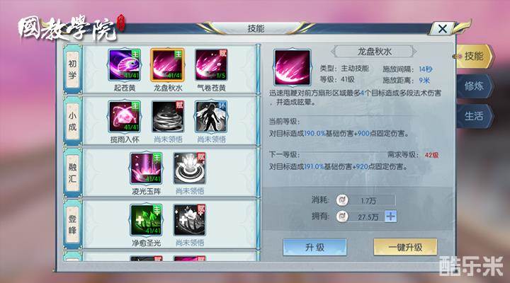 技能不仅是修为的体现,更是直接关系到PK时的伤害和打斗方式,主动技能升级需要消耗大量的银币,而被动技能则需要相应的秘籍来领悟;并且技能的等级不能高于人物等级,所以努力升级的同时及时提升自己的技能才是正确的提升修为的方式。