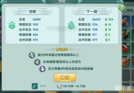 玩家初始进入游戏时是没有封号的,随着装备的强化和玩家成长,会渐渐满足封号升级的条件。每次升级封号需要几个条件:装备强化等级、宝石的镶嵌、相应数量的高品质装备、以及封号升级道具和银两等。