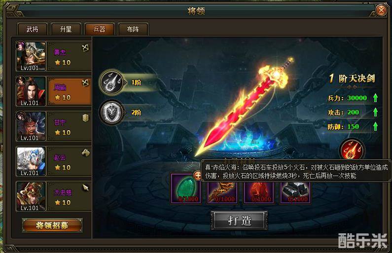 熔炉开启后,玩家可以在熔炉界面兑换打造武将兵器的材料,下面我们介绍一下武将兵器。