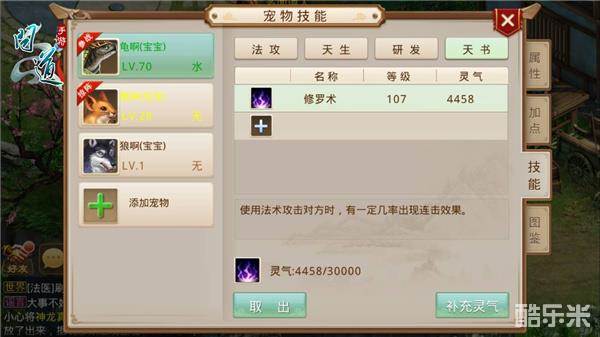 法系宠物的天书选择比较固定,可能也是法术攻击的天书较少的原因。一般都以提升宠物伤害为选择标准,推荐“怒击”、“降魔斩”和“修罗术”。