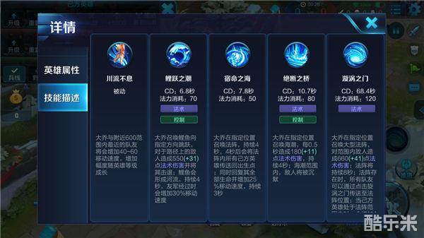 一技能-鲤跃之潮:大乔召唤鲤鱼向指定方向跳跃,对路径上的敌人造成法术伤害与击退效果,鲤鱼经过的区域将在短时间内增加范围内友军的移速。
