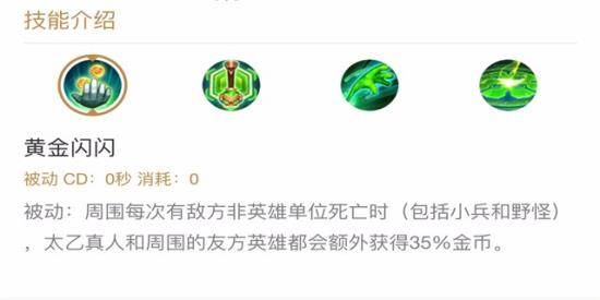 技能解析:太乙真人的被动是周围每次有敌方非英雄单位死亡时(包括小兵和野怪),太乙真人和周围的友方英雄都会额外获得35%金币,这个被动能够保证太乙真人单独一路发育能够最快将装备成型,如果是辅助下路队友,也能保证自己和队友的发育,不会因为自己而分了队友发育。