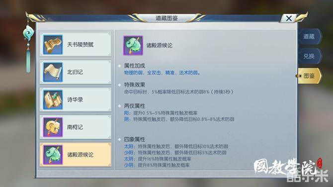 诸殿源候论可提升物理防御、精准、全攻击、法术防御,命中时有5%的概率降低目标8%的法术防御,可持续3秒。