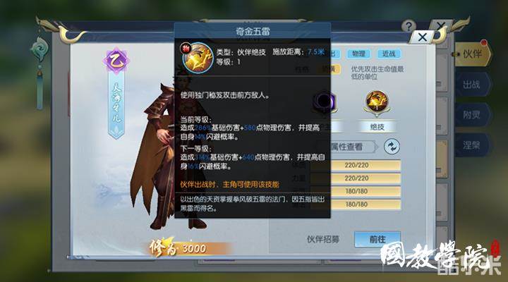 绝技:奇金五雷。使用独门秘籍攻击前方敌人。造成286%基础伤害+580点物理伤害,并提高自身14%闪避概率。