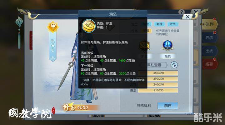 陈长生的护主技能鸿坚可以为主角提供全防御、全攻击和生命三种属性。很多伙伴在护主技能方面都提供像力量、智力等有门派局限性的属性,也就只能适用于对应的门派。而陈长生提供的全防御、全攻击和生命三种属性比较中规中矩,是每个门派都适合的,并没有剑走偏锋。一个输出属性和两个防御属性可以说是攻守兼备了。