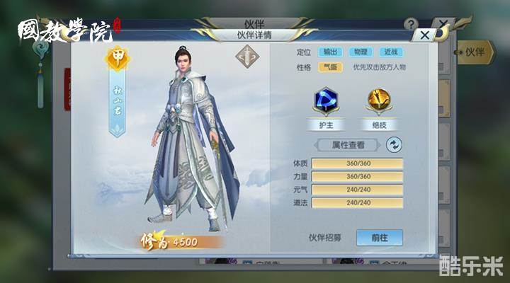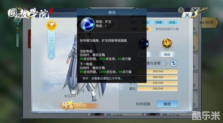 秋山君的护主技能为尧天。出战时增加主角40点全防御、1600点生命、20点力量。全防御就是物理防御和法术防御,是一个中规中矩的防御属性,而生命顾名思义就是提升主角的血量,也是提升生存的属性,单看这两个属性,是每个门派都适合的。而秋山君的护主技能还提供了力量,力量作为一级属性,对应的二级属性为物理攻击,这也就注定了秋山君只适用于物理门派了,也就是槐院和离山剑宗。