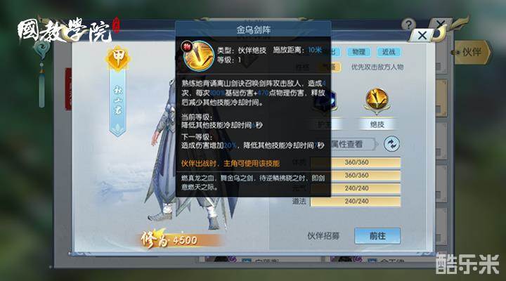 绝技:金乌剑阵。熟练地背诵离山剑诀召唤剑阵攻击敌人,造成4次,每次100%基础伤害+470点物理伤害,释放后减少其他技能冷却时间。