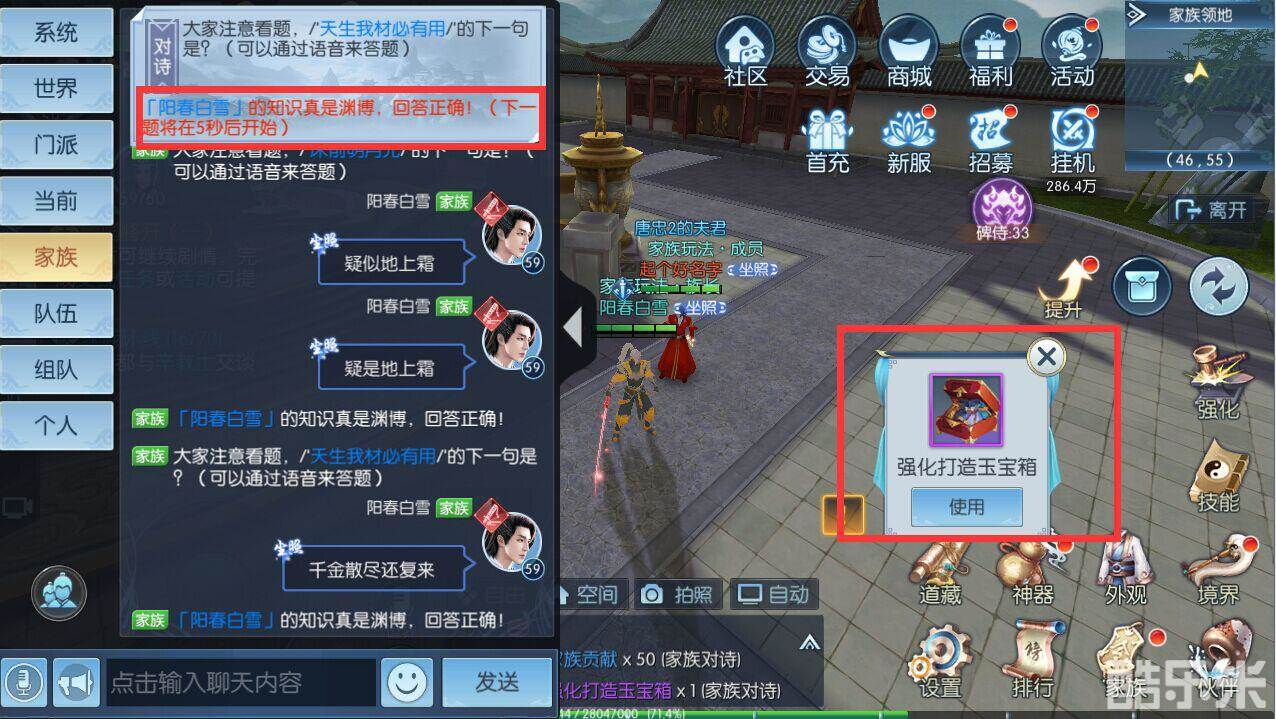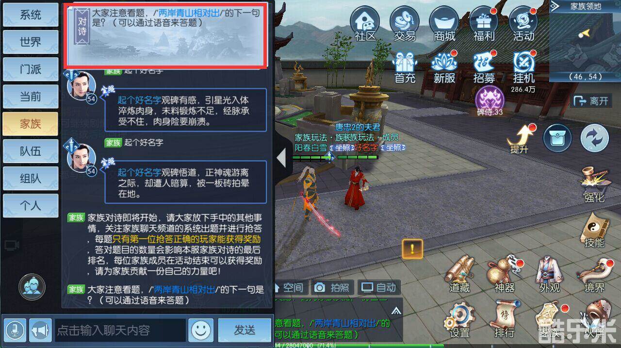 在活动时间内,系统将会在家族聊天界面出题,所有玩家都可以进行作答,在答题正确后会发布新的问题。