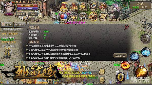 《烈焰龙城》副本开放等级为66级,等级达到要求的玩家,每天进入该副本3次,副本次数每天都会自动重置。你渴望得到海量的经验值?就不要错过每天的守卫龙城副本次数啦。玩家可以前往龙城安全区的左上方找到NPC“守卫龙城”,进行对话,在对话界面处会有守卫龙城副本的传送入口。玩家进入到副本后,将会获得系统赠送的8个弓箭手令牌。玩家在副本中间的合理位置,点击这些令牌的图标,就能在角色站立的位置,摆放上相应的弓箭守卫。守卫们就能自动帮你阻击扑面而来的怪物大军,大家摆放守卫的时候,将守卫贴近怪物所走的路线摆放,特别是拐角的地方,可多放几个守卫。