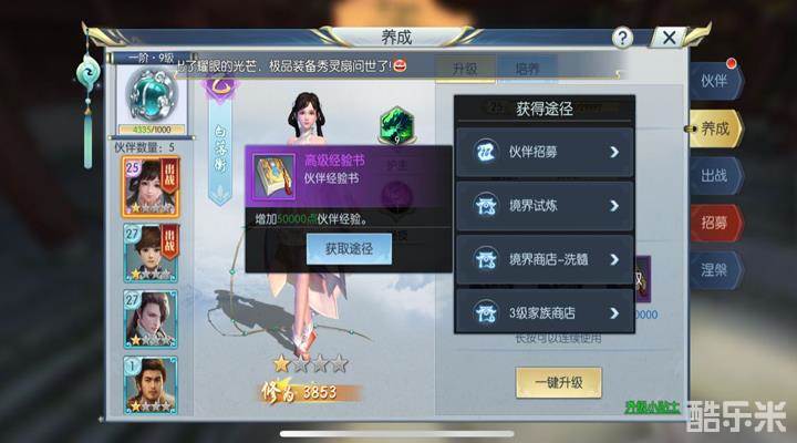和主角一样,伙伴也有等级之分,等级越高的伙伴其成长上限越高,所以提升伙伴等级是非常重要的。伙伴跟随我们一起出战,通过战斗就可以获取经验,同时我们可以用伙伴经验书来进一步提升伙伴的等级。