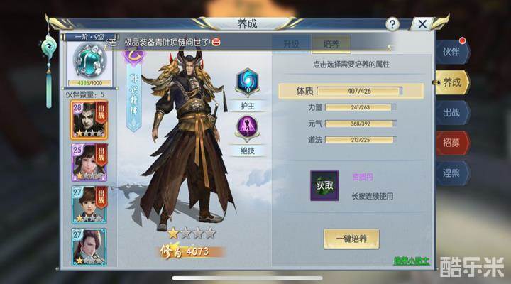 以上就是《择天记手游》中伙伴的培养了。如果想要让你的伙伴更加强力,为你的主角带来更多的收益,那么培养伙伴是必不可少的。不过在前期我们使用的大都是丙级、乙级伙伴,还有一些不适合自身门派的甲级伙伴,这些伙伴不建议着重培养,可以将资源留给最适合自己的伙伴。