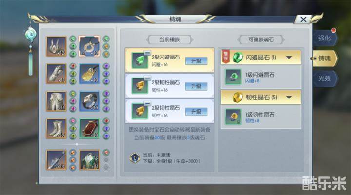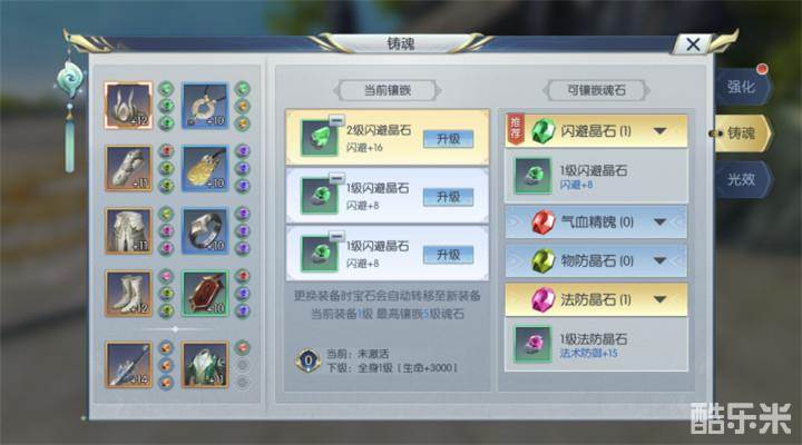 当道友们拥有宝石之后就可以将宝石镶嵌到我们的装备上了,找到装备强化按钮然后点击铸魂可以来到宝石镶嵌界面,在这里我们可以将宝石镶嵌在每一件装备上,每件装备可以镶嵌三颗宝石,全身一共十件装备,我们一共需要准备三十颗宝石来镶嵌所有的装备。