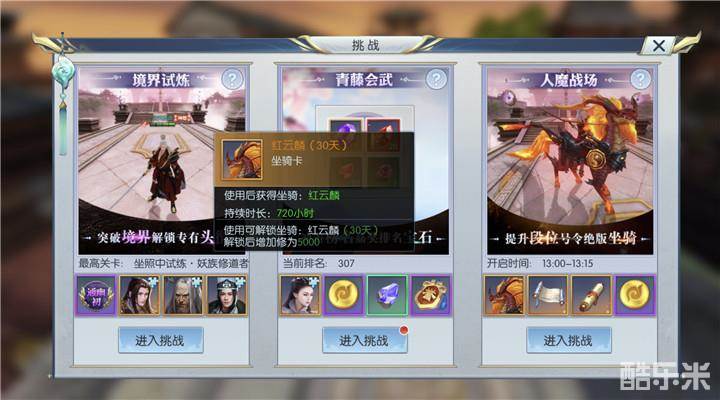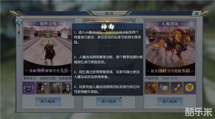 拥雪关是人魔战场两大战场之一,在每天大家参与的限时活动按钮中可以找到。点击游戏界面上方的挑战按钮,我们可以看到三个挑战玩法之一的人魔战场。人魔战场每日开启的时间是有限制的,战场开启的类型也有区别,每周一三五还有周日开启的是拥雪关战场,而每周二四六开启的则是乱山关隘,每天可以进入一次。